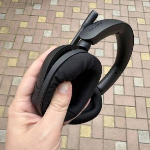 Microfonul este nedetașabil și legat pe mijlocul cupei stângi. Îl poți roti însă de la gură și până în poziția verticală, iar tija sa este ușor deformabilă pentru a-l apropia mai mult sau mai puțin de gură. Tot pe stânga se află o rotiță de volum, în trepte, și mufele jack audio și USB-C.